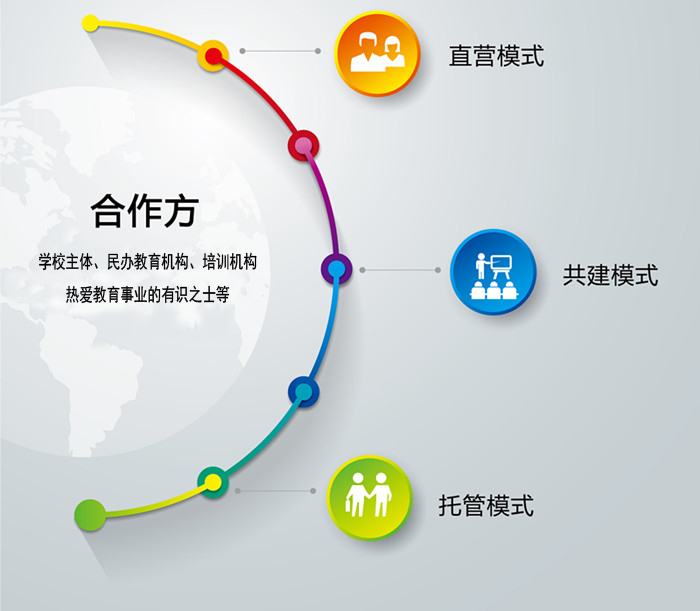 真诚地欢迎各学校、教育机构、投资机构及其他有教育情怀的单位和个人与我们强强联手,合作举办国际化、特色化、具有可持续发展竞争力的现代化精品名校,服务于社会。