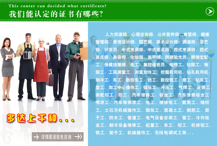 物流师、职业指导人员、企业人力资源管理师、企业信息管理师、理财规划师、企业培训师、广告设计师、公关员、婚姻家庭咨询师、公共营养师、社会工作、采购师、房地产策划师、企业文化师、安全防范设计评估师、商务策划师、会展策划师、健康管理师、报关员、金投资分析师、信用管理师、图书资料业务人员、安全评价师、智能楼宇管理师、劳动关系协调员、形象设计师、客户服务管理师、动画绘制员、速录师、数字视频(DV)策划制作师、可编程序控制系统设计师、数控程序员、酿酒师、数字视频合成师、花艺环境设计师、糖果工艺师、电影电视演员、电影电视演员、歌唱演员、歌唱演员、民族乐器演奏员、外国乐器演奏员、录音师、陈列展览设计人员、包装设计师、首饰设计师、模具设计师、模具设计师、家具设计师、制图员、话务员、电信业务员、用户通信终端维修员、通信网络管理员、营业员、出版物发行员、冷藏工、粮油保管员、中式烹调师、中式面点师、西式烹调师、西式面点师、调酒师、茶艺师、咖啡师、营养配餐员、餐厅服务员、前厅服务员、客房服务员、体育场地工、保健按摩师、足部按摩师、芳香保健师、水生哺乳动物驯养师、口腔修复工、有害生物防制员、锅炉操作工、美容师、美发师、摄影师、冲印师、眼镜验光员、眼镜定配工、洗衣师、修脚师、家用电子产品维修工、照相器材维修工、办公设备为维修工、家政服务员、养老护理员、锁具修理工、礼仪主持人、农艺工、农作物植保工、蔬菜园艺工、花卉园艺师、家畜饲养工、家禽饲养工、水生生物病害防治员、淡水水生动物养殖工、沼气生产工、工程测量工、房产测量员、油、气井测试工、油气管道保护工、铝电解工、气体净化工、制冷工、防腐蚀工、化工总控工、工具钳工、数控机床装调维修工、数控机床装调维修工、电机装配工、高低压电器装配工、电子仪器仪表装配工、电工仪器仪表装配工、防毒器材装配工、防毒器材装配工、机修钳工、农机修理工、汽车修理工、摩托车维修工、饮料制作工、常用电机检修工、创业咨询师、鉴定估价师、科技咨询师、物业管理师、宝玉石检验员、保安员、殡仪服务员、玻璃分析检验员、变配电室值班电工、变压器、互感器装配工、玻璃熔化工、抄表收费核算员、车站值班员、宠物医师、船体装配工、粗纱工、地勘钻探工、电焊条制造工、电力电缆安装工、电气试验员、电切削工、电信机务员、电子计算机(微机)装配调试员、电子器件检验工、发电厂电机检修工、反射疗法师、纺织面料设计师、纺织纤维检验工、纺织针织染色工、风力发电运行检修员、钢琴调律师、高压线路带电检修工、高压线路架设工、工程机械修理工、贵金属首饰、钻石、宝玉石检验员、贵金属首饰检验员、合成氨生产工、化工工艺试验工、化妆品配方师、会展设计师、激光机装调工、集成电路测试员、集控值班员、计算机软件产品检验员、继电保护员、家用纺织品设计师、金属挤压工、紧急救助员、菌类园艺工、咖啡师、快递业务员、沥青混凝土摊铺机操作工、滤毒材料制造工、轮胎翻修工、民航乘务员、墓地管理员、内燃机车司机、品酒师、评茶员、漆器镶嵌工、汽车(拖拉机)装配工、汽车运输调度员、染料生产工、肉制品加工工、市场管理员、水泥混凝土摊铺机操作工、陶瓷工艺师、陶瓷烧成工、陶瓷原料准备工、陶瓷装饰工、铁路线路工、铁路信号工、脱硫值班员、玩具设计师、网络编辑员、无线电调试工、舞台监督、线务员、橡胶炼胶工、鞋类设计师、压路机操作工、压缩机工、岩土工程地质工、养老护理员艺术化妆师、印染工艺检验工、有机合成工、有线广播电视机线员、闸门运行工、制米工、制鞋工、中央空调系统操作员、轴承检查工、助听器验配师、钻石检验员、照明设计师、常用电机检修工、维修电工、维修电工、电子设备装接工、橡胶硫化工、服装制作工、鞋工、白酒酿造工、啤酒酿造工、酶制剂制造工、酱油酱类制作工、食醋制作工、酱腌菜制作工、糕点、面包烘焙工、猪屠宰加工工、手工木工、精细木工、玻璃配料工、音响调音员、印前制作员、平版印刷工、贵金属首饰手工制作工、装饰美工、钢琴及键盘乐器制作工、混凝土工、坝工模板工、钢筋工、架子工、防水工、装饰装修工、机械设备安装工、电气设备安装工、管工、汽车驾驶员、叉车司机、起重工、化学检验工、无损检测员、食品检验工、乳品检验工、机动车检验工、粮油质量检验员、室内装饰装修质量检验员、衡器计量检定工、化工仪表维修工、舞蹈演员(芭蕾舞演员)、车工、数控车工、铣工、数控铣工、磨工、镗工、组合机床操作工、加工中心操作工、锻造工、焊工、金属热处理工、热处理工、冷作钣金工、涂装工、装配钳工、工具钳工、摩托车维修工、变电站值班员、电力负荷控制员、变电设备安装工……