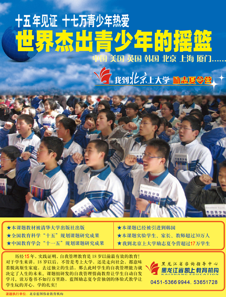 由国内知名教育专家黄泰山老师创办的中国第一品牌夏令营蓝图系列“我到北京上大学”已有15年历史,截止目前已有17万名青少年参加!